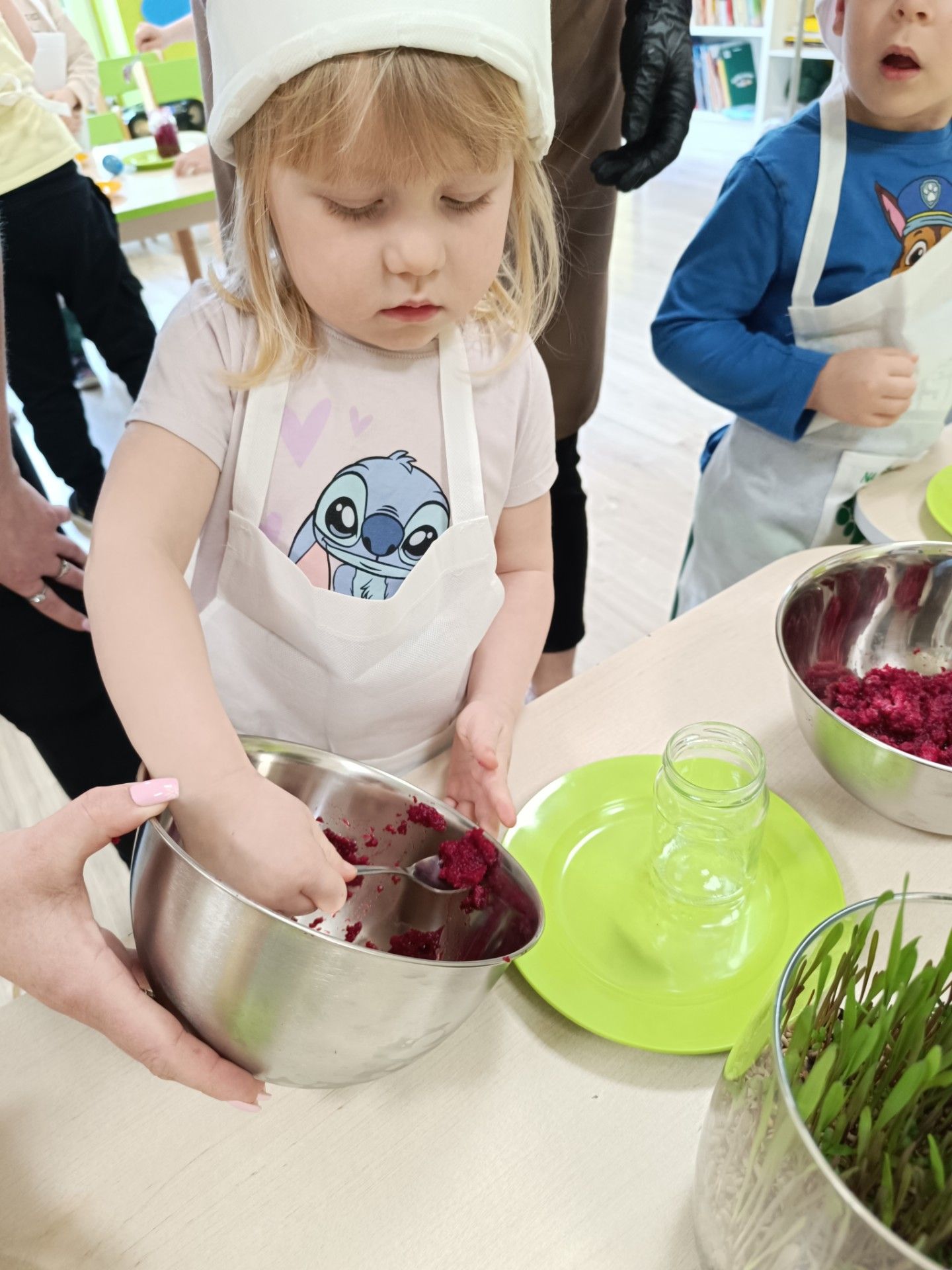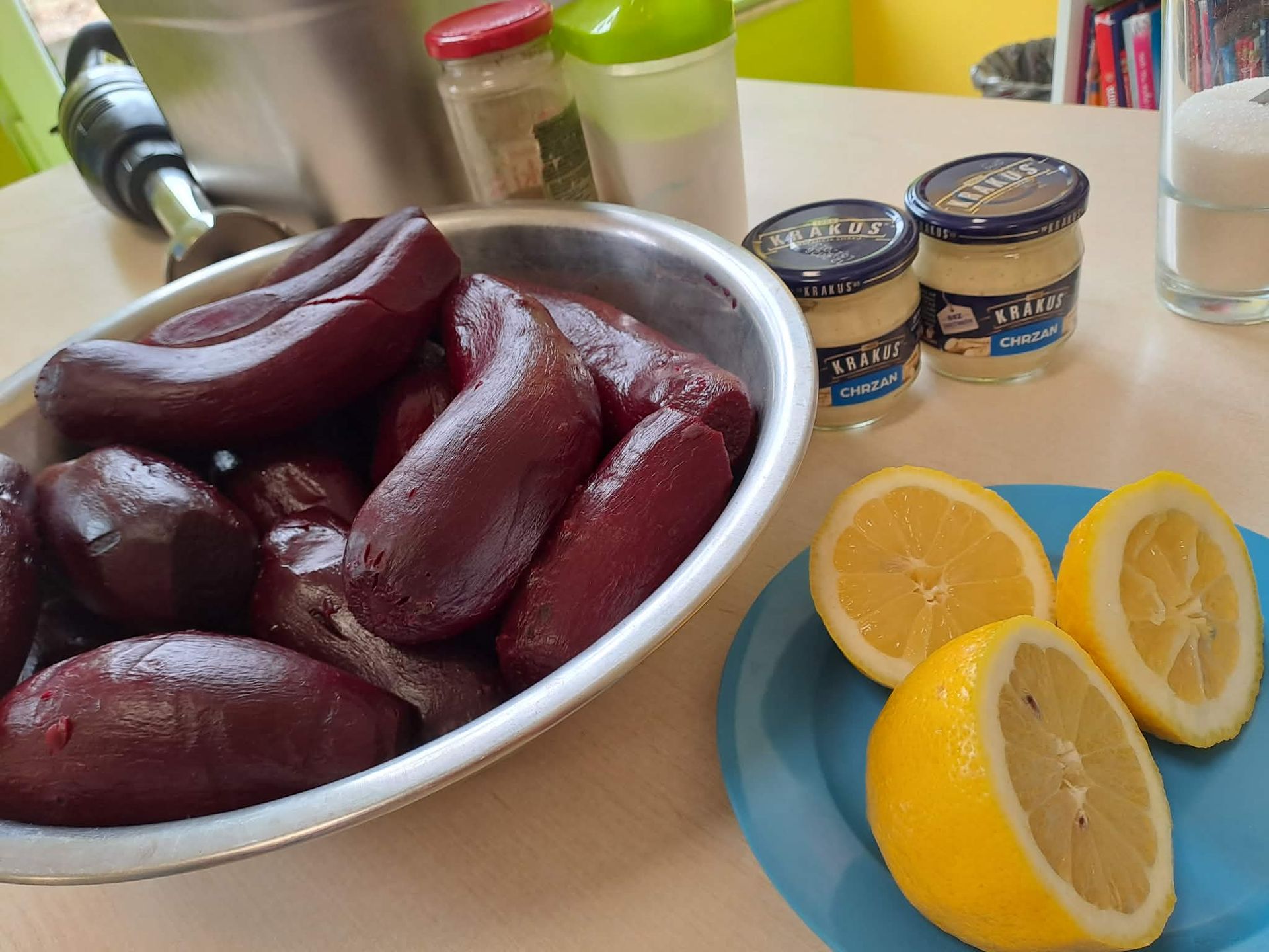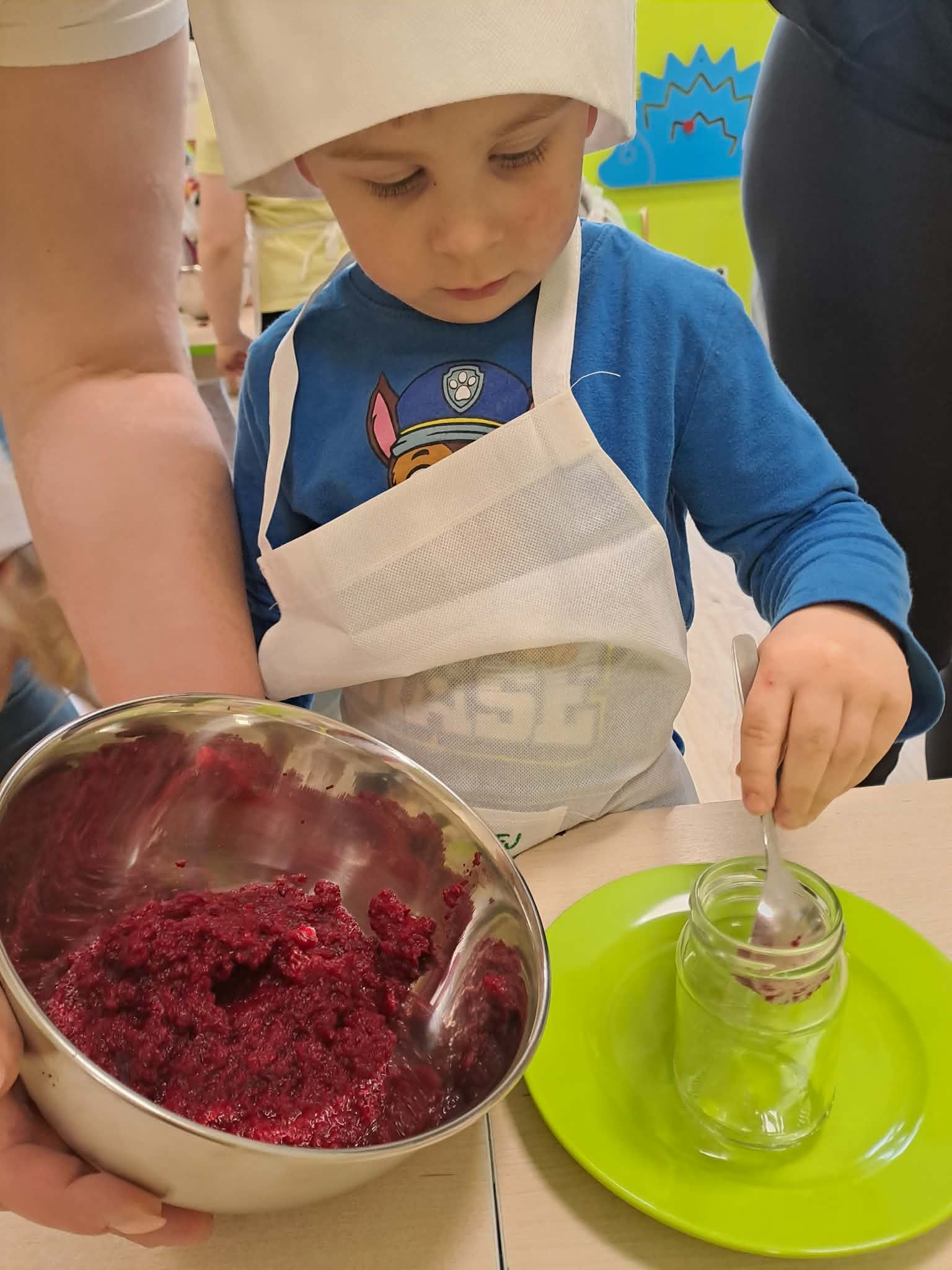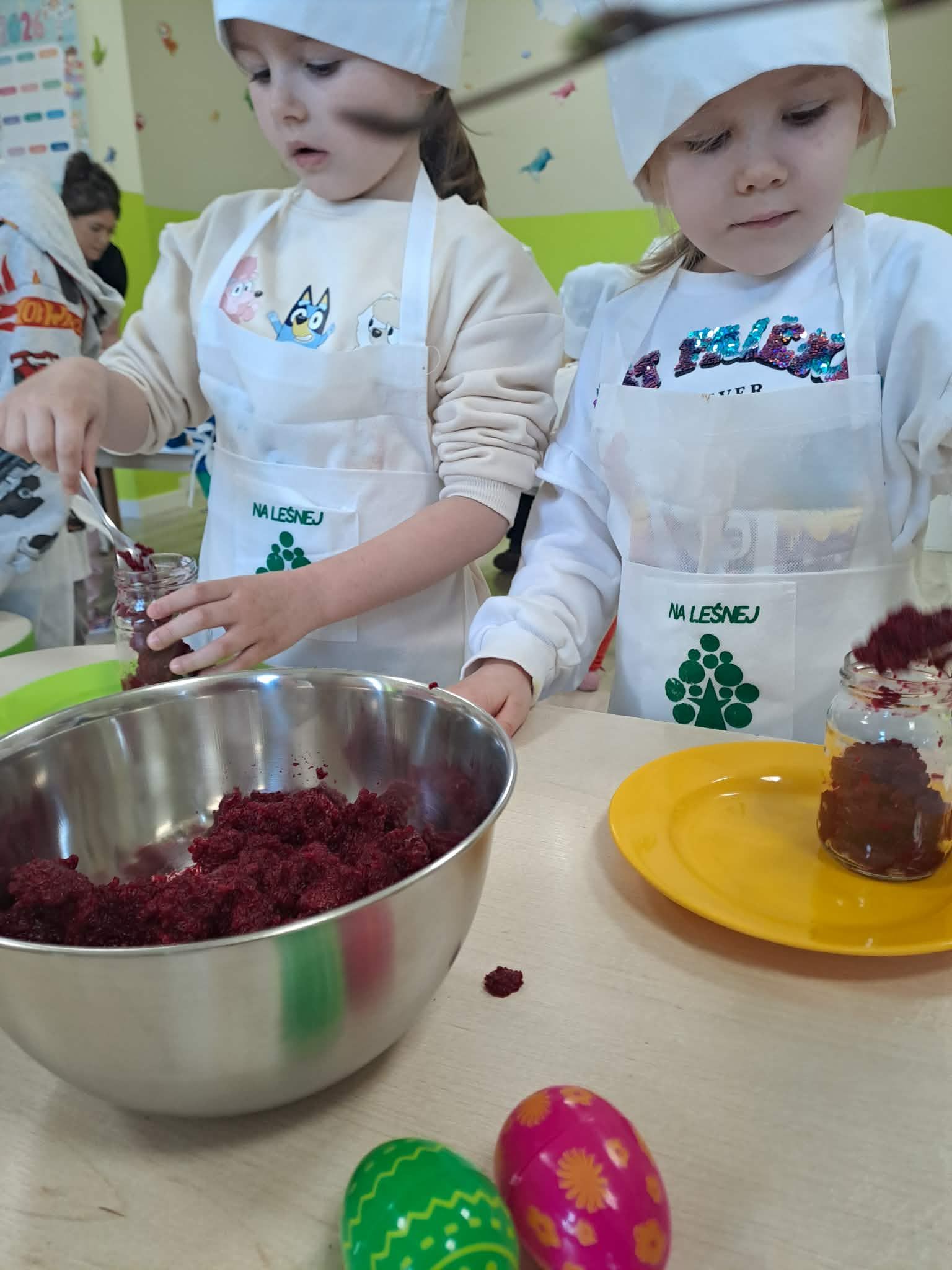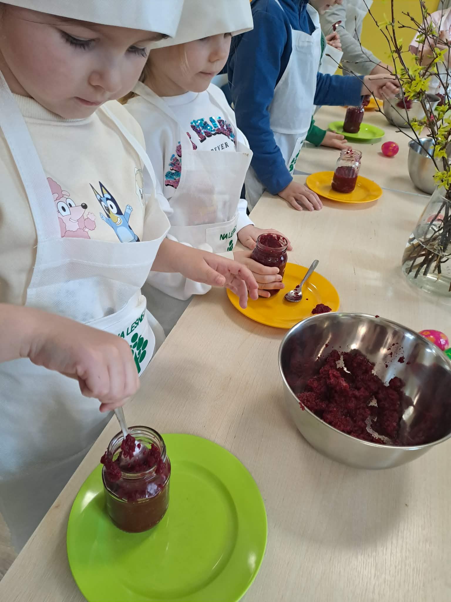 Wielkimi krokami zbliżają się święta więc jest okazja do tego aby mali kucharze własnoręcznie na zajęciach kulinarnych przygotowały zdrową ćwikłę. Ugotowane czerwone buraki, starty chrzan i sok z cytryn to podstawa pysznej ćwikły. Zabrali sie do pracy i przygotowaną ćwikłe zamknęli w pięknych słoiczkach. Te ozdobione słoiczki z życzeniami świątecznymi i co najważniej napełnione pyszną, zdrową ćwikłą ozdobią wielkanocne stoły naszych przedszkolaków. Smacznego